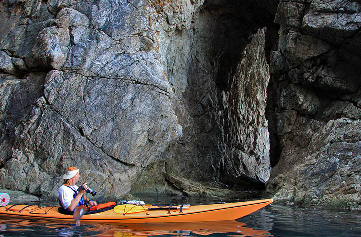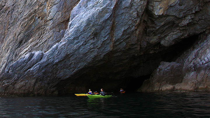 Такая скальная расщелина запросто приютит и большую флотилию каякеров, чем наша.