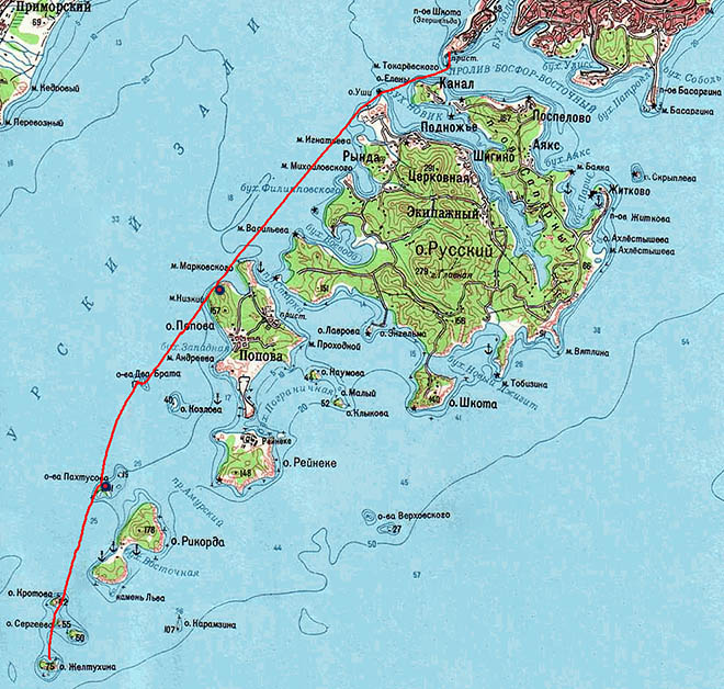 В 14:00, оттолкнувшись от береговой полосы Эгершельда, направился к острову Попова и через 2 часа трансритмичного вращения веслом успешно высадился на небольшом каменистом пляже за бухтой Алексеева. Надо отметить, что данный отрезок пути в 16 км как-то уже традиционно прохожу за это время, а вот за Поповым сопротивляемость среды стабильно возрастает, соответственно падает скорость, несмотря на увеличение затрачиваемых усилий.
