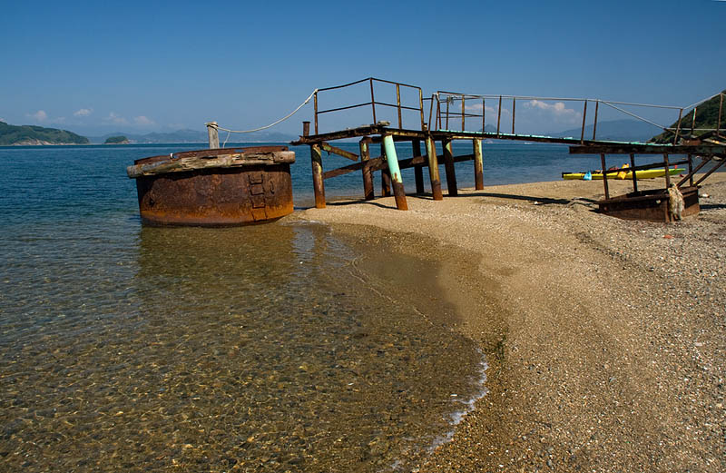 Сразу направились в сторону бухты Средней, где разместился дельфинарий, переехавший из Владивостока в более чистые воды. Зашли в бухту, а на пирсе как раз идет то ли выгрузка белухи с рядом стоящего судна в вольер, то ли наоборот. Управляющий этим процессом как-то недобро отреагировал на наше приближение, вскинув руками, гневно рыкнул, правда, с далека сложно было разобрать конкретику выпущенных слов, но и так стало понятно, что к приему гостей здесь совсем не готовы. Развернулись и ушли. |