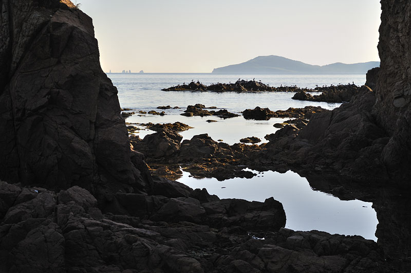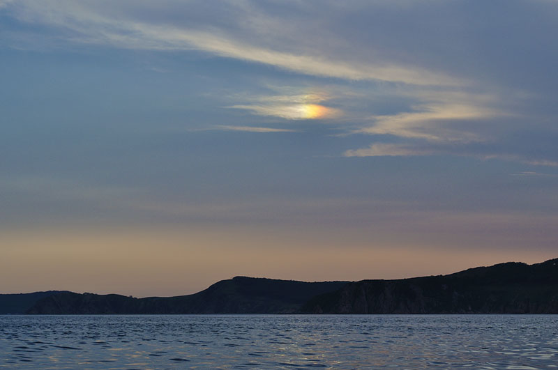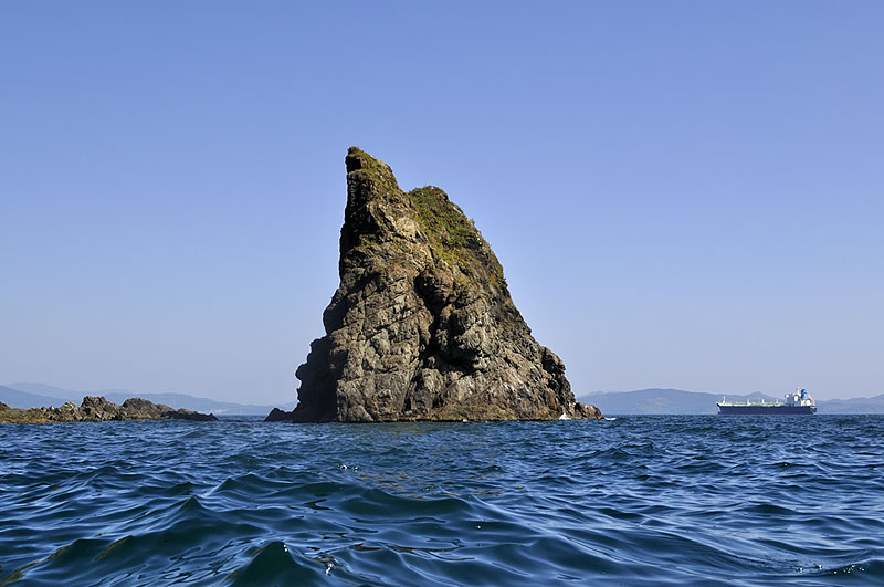 Перед переходом на остров спешились на живописном мысе Трамбецкого. За ним уже идет закрытая для гражданских территория. Сашин иностранческий паспорт не давал нам особо расслабляться в этих местах, даже несмотря на то, что я зарегистрировал маршрут в соответствующих службах, и поэтому стоящий посреди залива (который нам предстояло пересечь) сторожевик немного напрягал. Правда надолго он не задержался, изрядно накоптив, ушел в сторону открытого моря, и мы без приключений переправились на Путятин. |