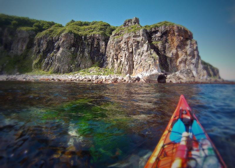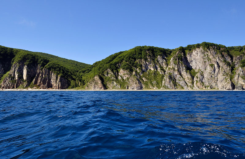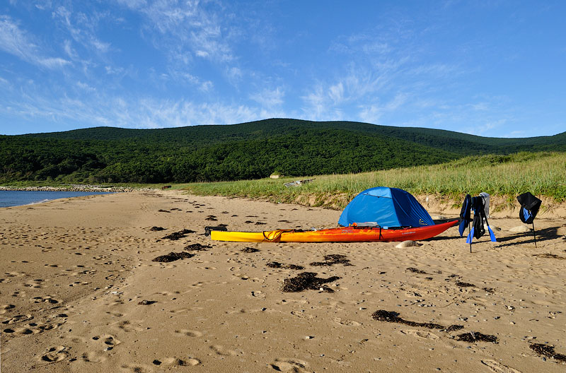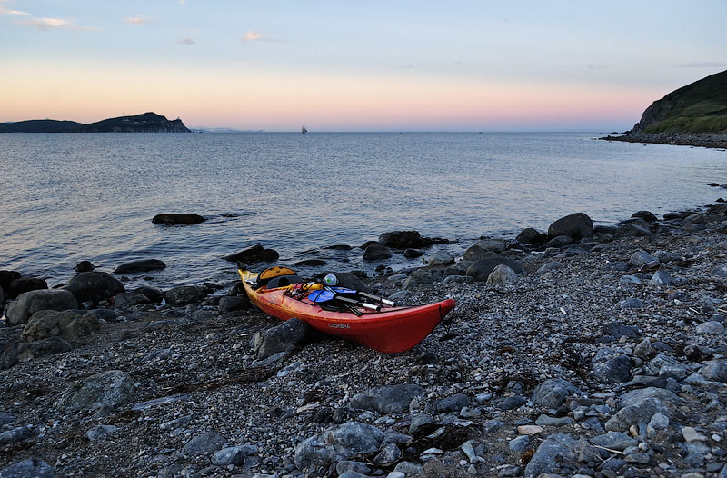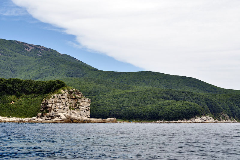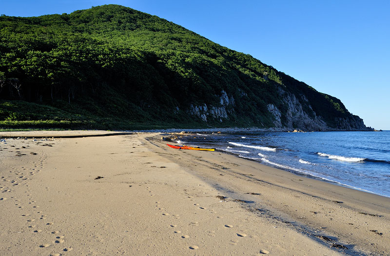 Далее встретился еще один, ну а затем пошли уже сплошные пологие берега вплоть до залива Ольги. Дойдя до мыса Мраморный, что на входе в залив, и оценив идущие дальше скалы, решил, что для 19 часов бухта, которую только что пересек, будет самым оптимальным вариантом для моего выхода на берег. |