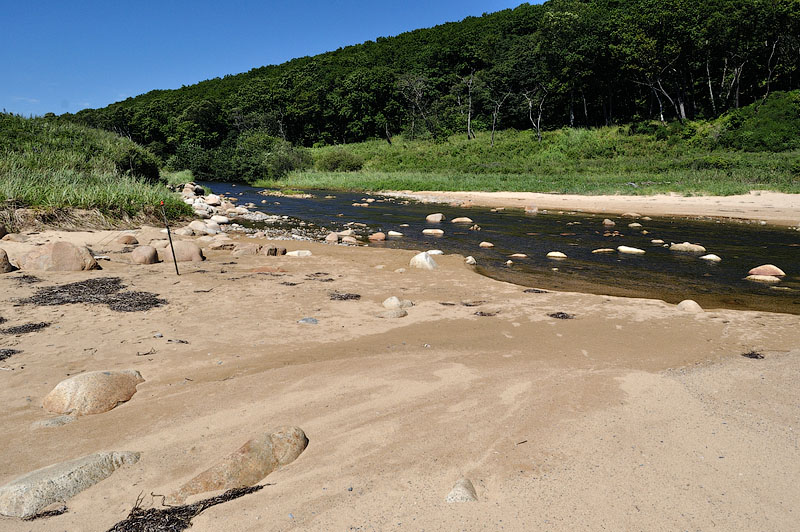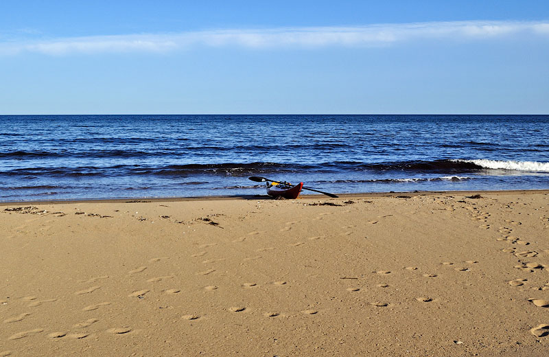 Если внимательно присмотреться, то можно увидеть, как у кромки воды стоит мужчина и с ним пара ребятишек. Они, провожая меня взглядом, кричат – «э-э-э-й, каякер, счастливого пути...». Про взгляд и слова не ручаюсь, но то, что они там находятся – это точно. |