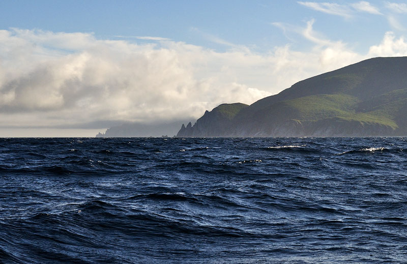 Вид на оставшиеся за кормой мысы Собора и Баратынского. К вечеру море стало жестче, ветер усилился, но, как и в течение всего дня, их взаимное направление в основном было на 10-11 часов к моему ходу, т.е. такой вариант... подгоняющий. |